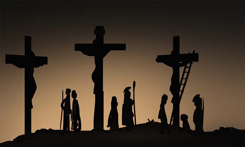 Kivezették a városból a Golgota nevű helyre, ahol felszögezték egy keresztre. Tőle jobbra és balra egy-egy bűnözőt feszítettek keresztre.